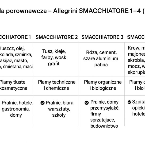 Allegrini SMACCHIATORE 3 750ml to profesjonalny odplamiacz do zadań specjalnych, zaprojektowany do usuwania plam pochodzenia mineralnego, takich jak rdza, cement czy utlenione metale. Gotowy do użycia, skuteczny i bezpieczny dla tkanin przemysłowych. Idealny wybór dla firm budowlanych, pralni, warsztatów i serwisów sprzątających.