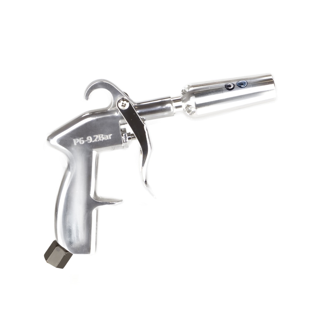 Pistolet do użytku profesjonalnego – doskonale nadaje się do suszenia dużych obszarów (poprzez emisję szerokiego strumienia powietrza), trudno dostępnych miejsc i ogólnych prac warsztatowych, wymagających osuszania wszelakich powierzchni. Wyższy przepływ powietrza – 100% objętości powietrza poprzez zastosowanie dyszy Venturiego. Bezstopniowa regulacja ilości powietrza w dźwigni operacyjnej. Złącze w komplecie. Dane techniczne:- Zużycie powietrza: 170 l/min