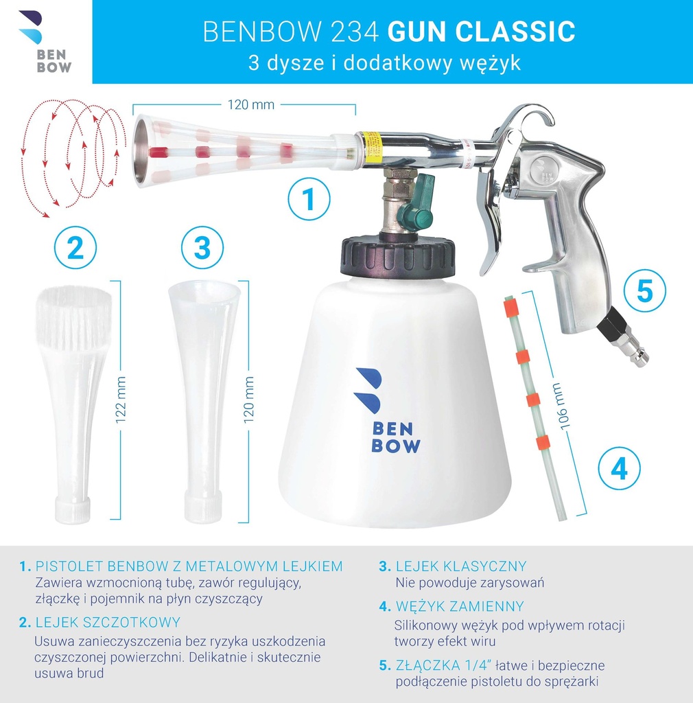 BenBow 234 Classic to wydajny, profesjonalny pistolet czyszczący z trzema dyszami w zestawie, stworzony z myślą o efektywnym i precyzyjnym usuwaniu zabrudzeń przy pomocy sprężonego powietrza i środka czyszczącego. Solidna konstrukcja, ergonomiczna budowa i bogaty zestaw akcesoriów sprawiają, że to narzędzie idealne zarówno dla profesjonalistów, jak i pasjonatów detailingu.
