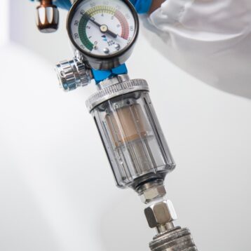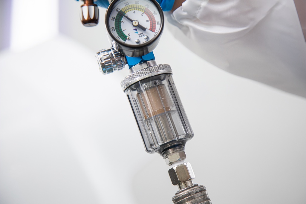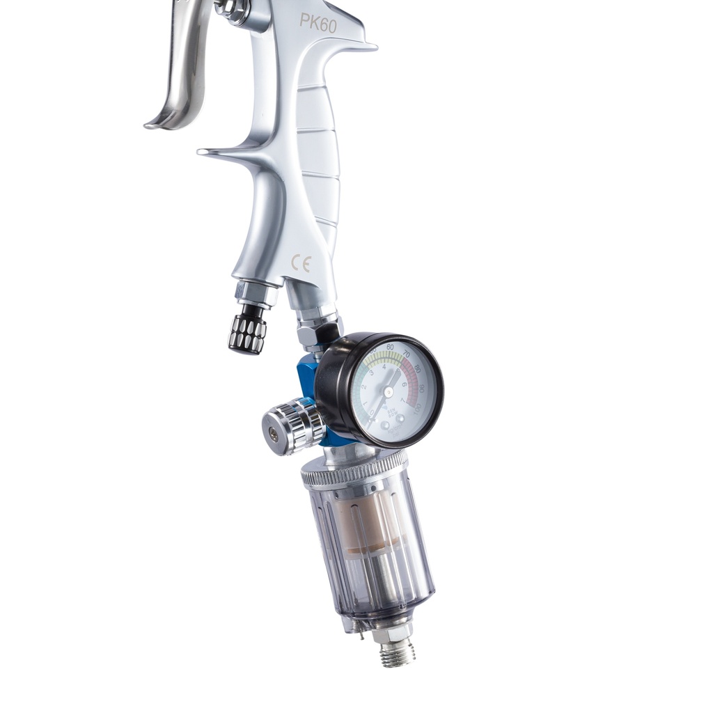 Zamontuj regulator bezpośrednio przy pistolecie lakierniczym, czyszczącym lub przedmuchowym za pomocą złącza 1/4” BSP. Ustaw odpowiednie ciśnienie przy pomocy pokrętła i obserwuj wartości na wbudowanym manometrze. Regularnie opróżniaj zbiornik odwadniacza, korzystając z zaworu spustowego.