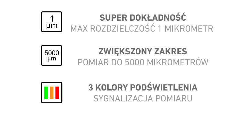 • rozdzielczość pomiaru: 1 µm <500 µm, 10 µm <2000 µm oraz 100 µm <5000 µm
