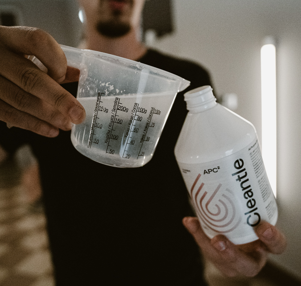 - Rozcieńcz produkt w stosunku 1:10 (100 ml produktu na 1 l wody) lub 1:20 (50 ml produktu na 1 l wody), w zależności od poziomu zabrudzeń.
