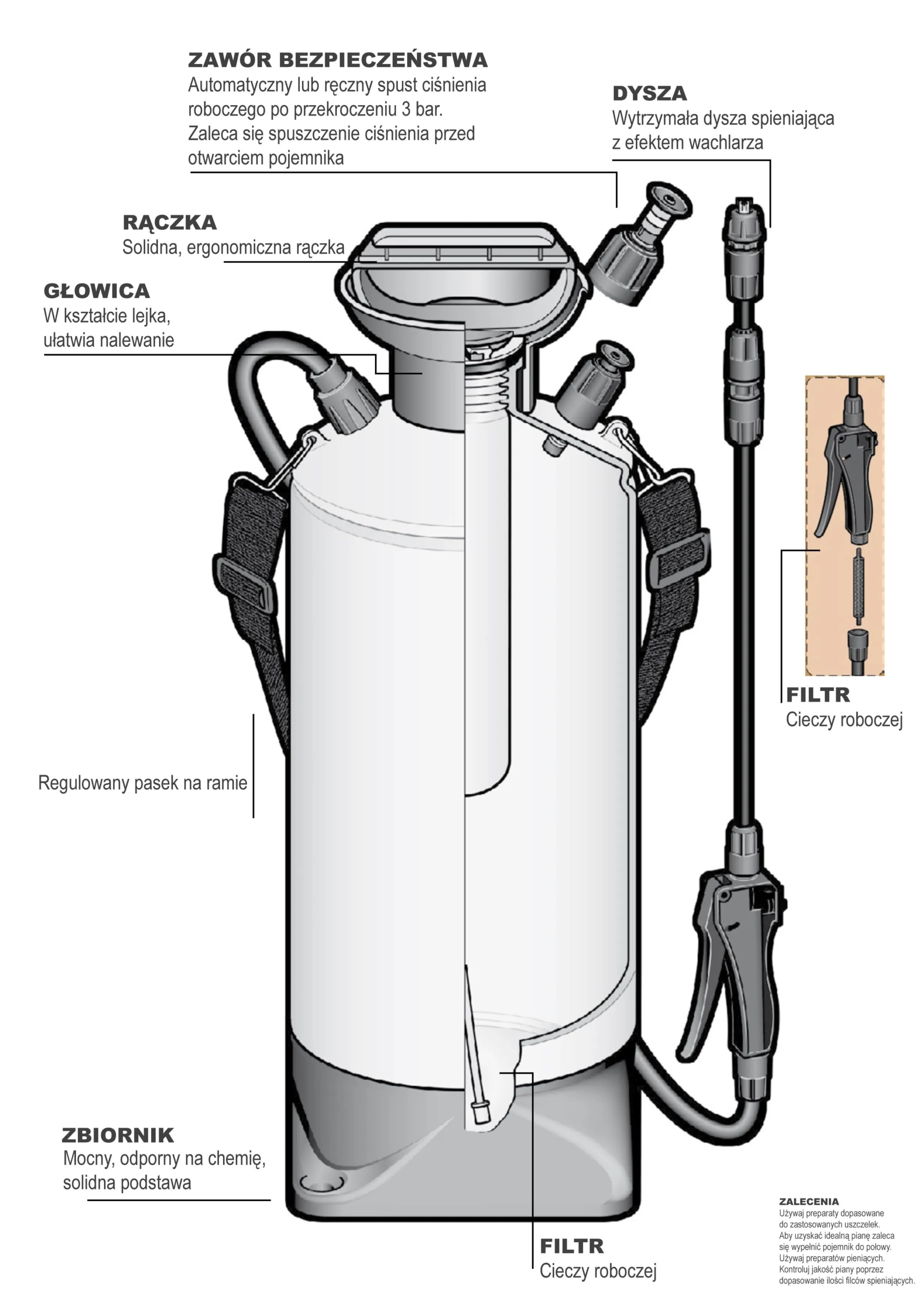 EPOCA TEC ONE FOAMER EPDM to wysokiej klasy ręczna pianownica o pojemności 10L, stworzona z myślą o profesjonalnym i domowym zastosowaniu. Dzięki uszczelnieniom EPDM oraz zbiornikowi z odpornego tworzywa sztucznego doskonale radzi sobie z agresywnymi środkami chemicznymi, takimi jak kwasy i zasady. Wyposażona w regulowaną dyszę wachlarzową, zawór bezpieczeństwa, wąż 1,4 m i lancy 60 cm — zapewnia wygodną i efektywną pracę w myjni, warsztacie, firmie sprzątającej oraz przy domowym sprzątaniu.