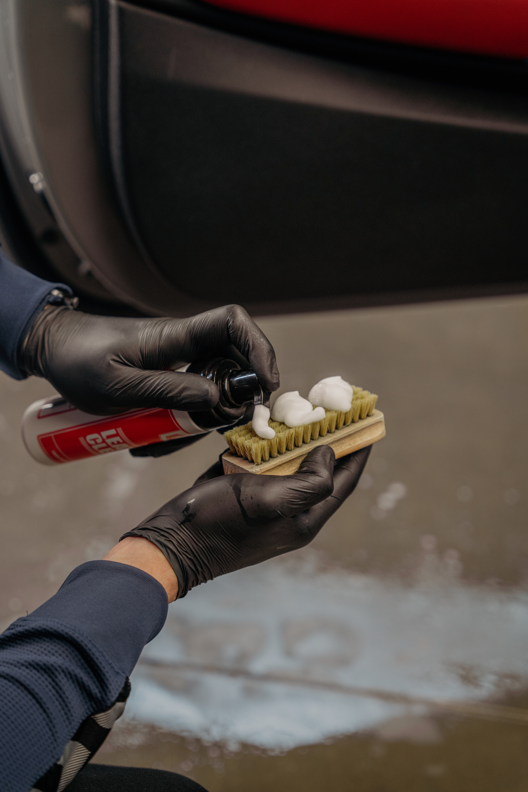 - Nałóż pianę na szczotkę do czyszczenia skóry