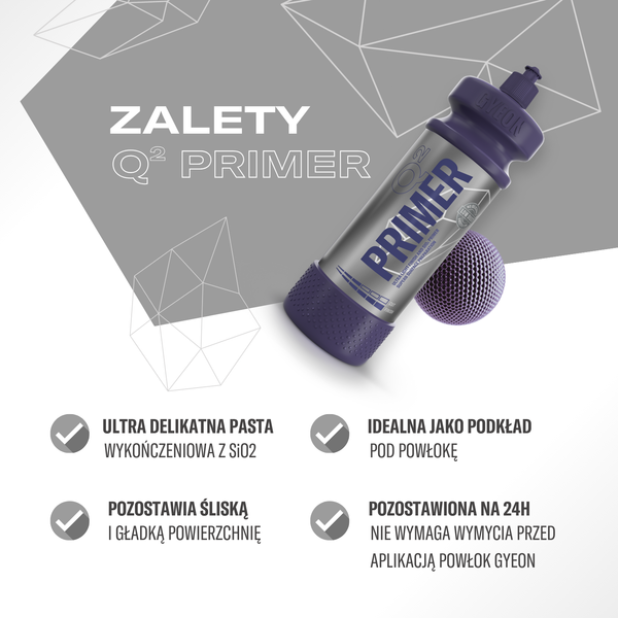 GYEON Q² PRIMER to unikalna pasta wykończeniowa łącząca funkcję delikatnego finiszu z gruntowaniem SiO₂. Produkt doskonale przygotowuje każdy lakier pod aplikację powłoki ceramicznej, tworząc gładką, śliską powierzchnię o wyjątkowym połysku. Q² PRIMER minimalizuje ryzyko powstawania defektów podczas finalnego zmywania, umożliwiając perfekcyjne wykończenie nawet na trudno obrabialnych lakierach. Produkt nie wymaga dodatkowego zmywania ani odtłuszczania, co oszczędza czas i zapewnia idealną bazę pod powłokę.