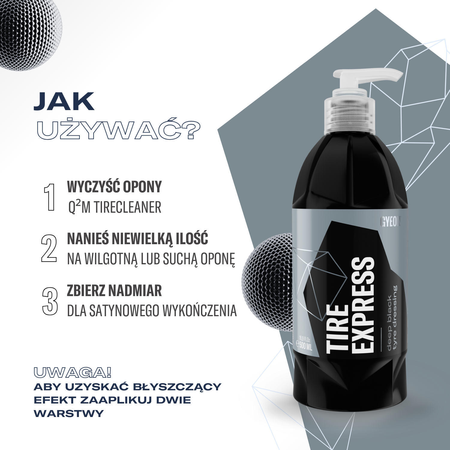 GYEON Q²M Tire Express to idealny dressing do opon i elementów gumowych, stworzony z myślą o regularnej pielęgnacji. Zapewnia świetne wykończenie i jest niezwykle łatwy w aplikacji, co sprawia, że jest doskonałym rozwiązaniem dla entuzjastów detailingu i profesjonalistów. Produkt jest teraz dostępny w nowym opakowaniu i większej pojemności 4 litrów.