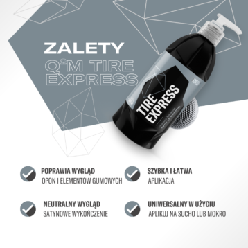 Gyeon Q²M Tire Express to niezawodny dressing do codziennej pielęgnacji opon, który łączy szybkość aplikacji z trwałym efektem wizualnym. Produkt nadaje oponom świeży wygląd i subtelną głębię koloru, jednocześnie odpychając wodę i brud dzięki hydrofobowej warstwie ochronnej. Wodna formuła pozwala na nakładanie preparatu na mokre lub suche opony, bez smug i długiego wcierania. Idealny do odświeżania wyglądu opon po myciu auta lub dla bieżącej pielęgnacji.