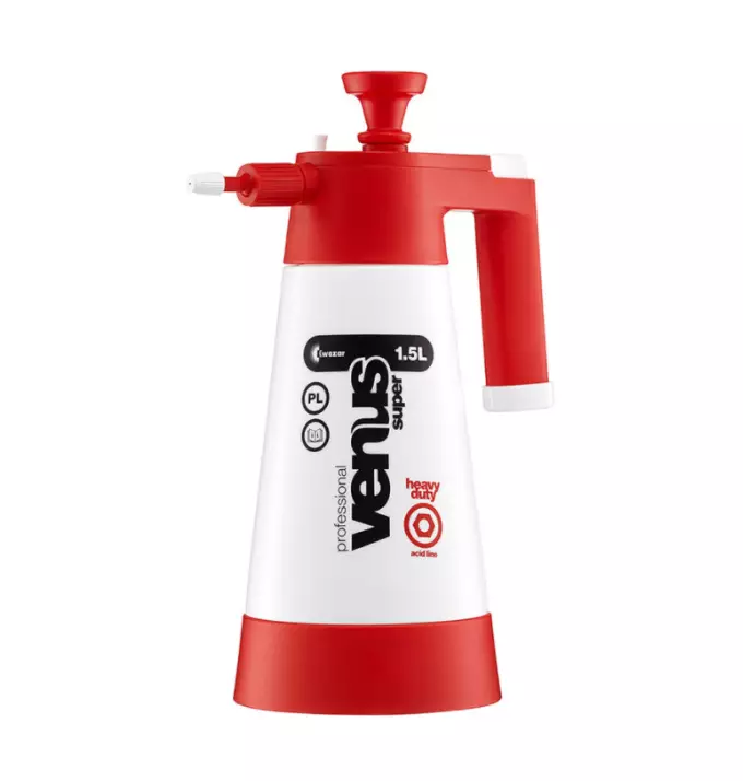 Kwazar Venus Super HD Acid Line 1,5L to opryskiwacz stworzony z myślą o pracy w trudnych warunkach z agresywną chemią. Wytrzymała konstrukcja, odporne uszczelnienia vitonowe i praktyczne funkcje sprawiają, że jest niezastąpionym narzędziem w myjniach, warsztatach i budownictwie.