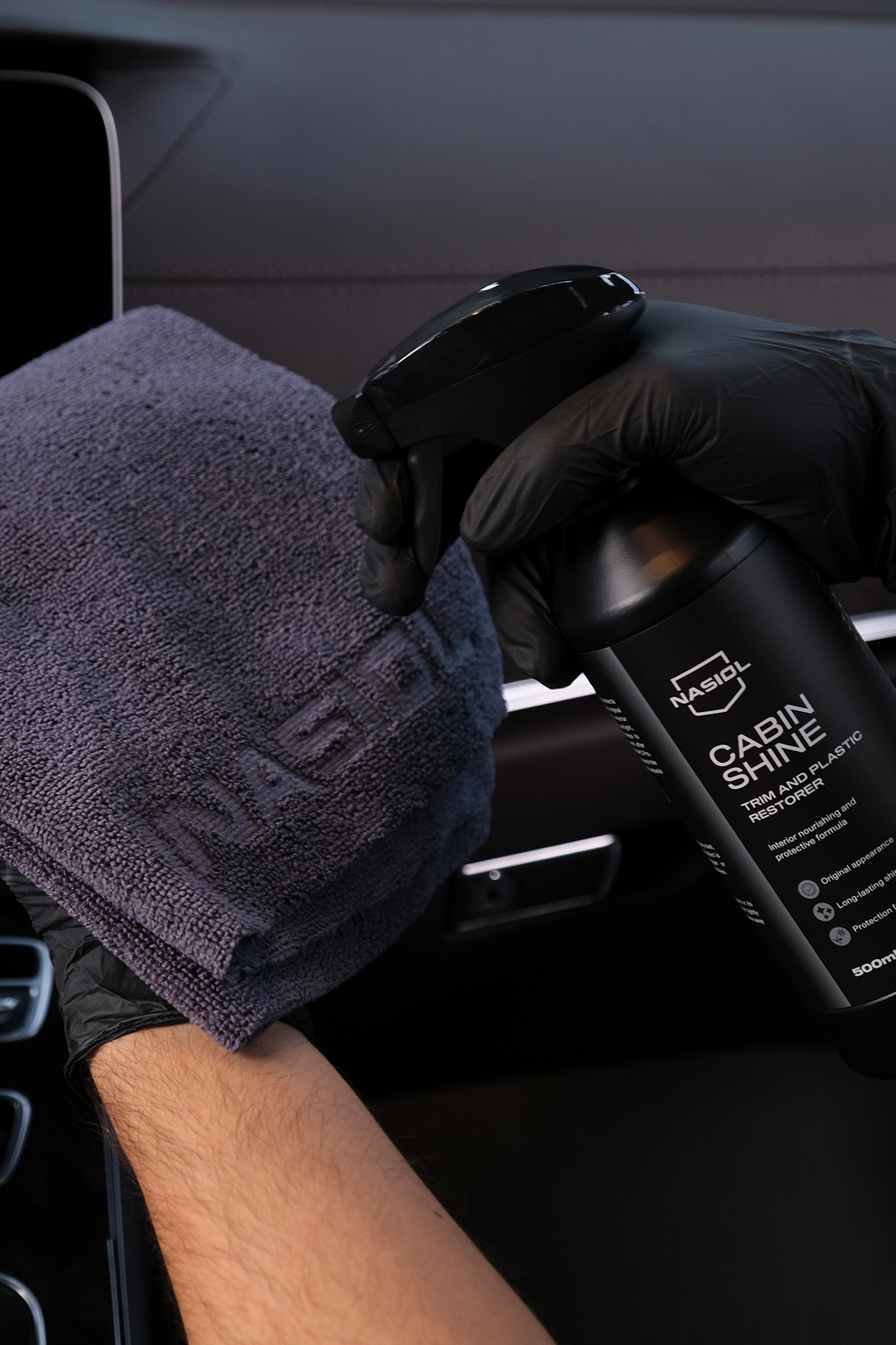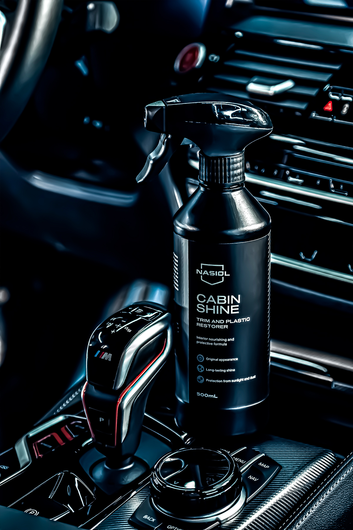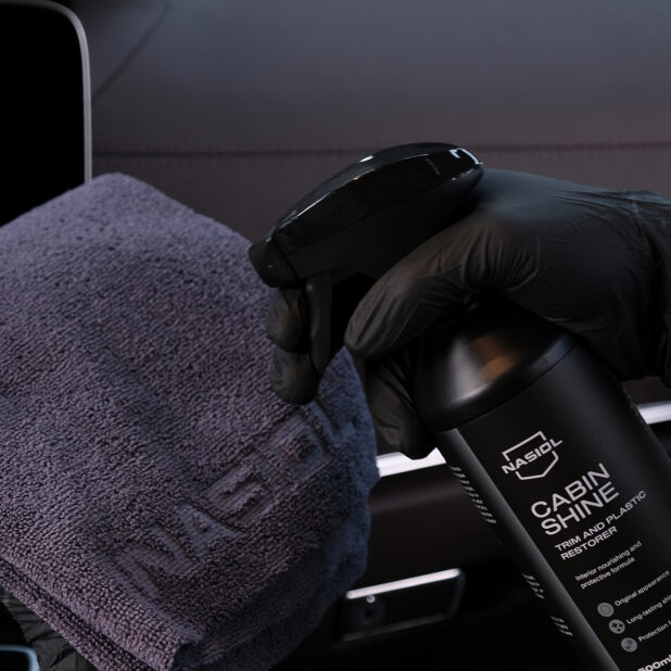Nasiol CabinShine to zaawansowany dressing do kokpitu nadający delikatnie satynowy efekt elementom plastikowym, winylowym, chromowanym oraz lakierowanym jak Black Piano.