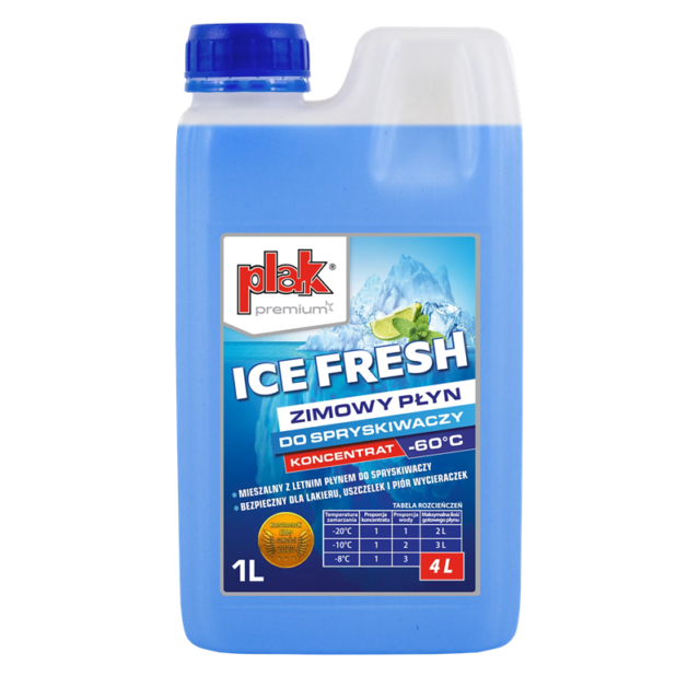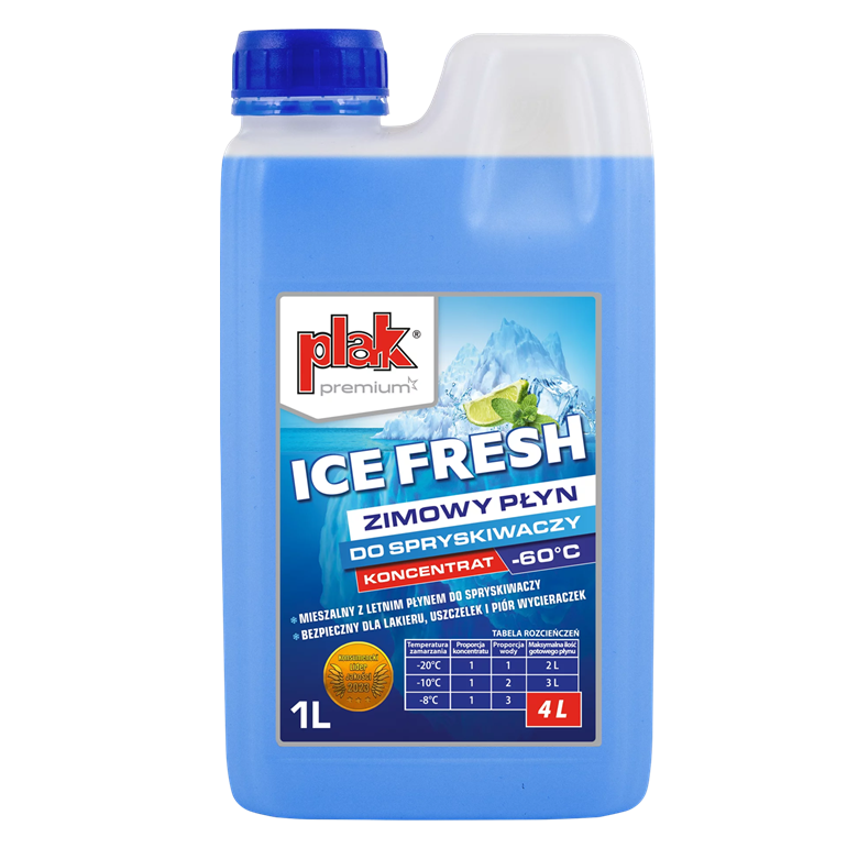 PLAK Zimowy płyn do spryskiwaczy -60°C ICE FRESH koncentrat 1l to nie tylko skuteczność w mroźne dni, ale także oszczędność i wygoda. Zamów już dziś i bądź gotowy na każdą zimową niespodziankę!