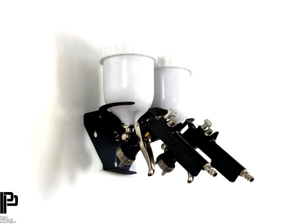 Wysokiej jakości uchwyt do bezpiecznego przechowywania pistoletów natryskowych z regulacją miejsca oparcia dla różnej wielkości pojemników na płyn. Możliwość zawieszenia dwóch pistoletów jednocześnie.