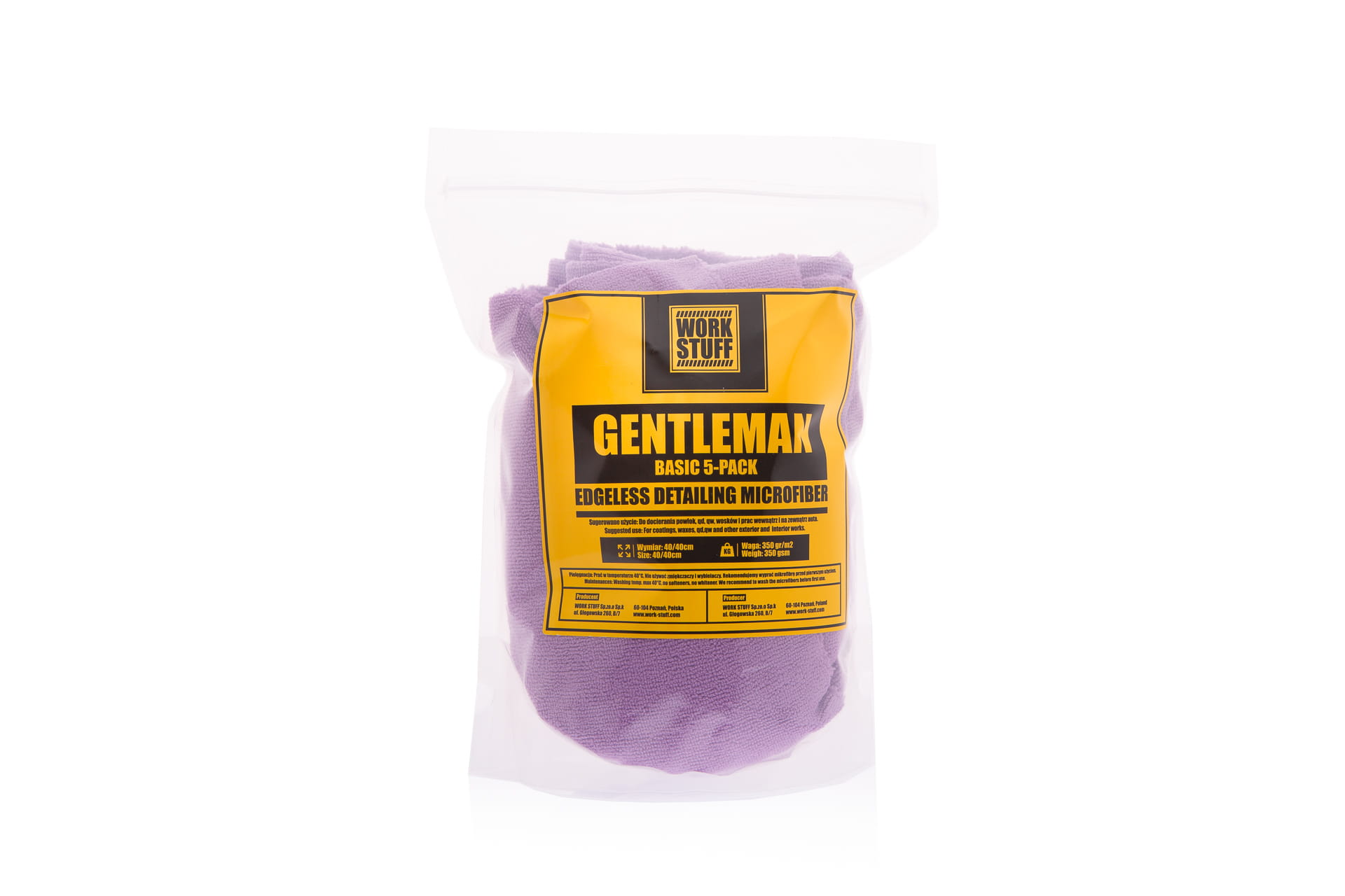 Work Stuff Gentleman Basic Purple 5-Pack to ekonomiczny zestaw zawierający pięć sztuk wysokiej klasy mikrofibr z serii Gentleman Basic. Jest to idealne rozwiązanie dla detailerów i pasjonatów, którzy potrzebują większego zapasu ściereczek do kompleksowego przeprowadzenia konkretnego etapu prac (np. docierania powłoki na całym aucie lub czyszczenia całego wnętrza).